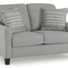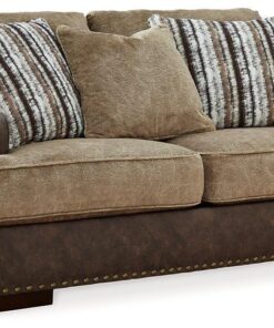 Punctuated by a subtle band of nailhead trim, this loveseat is perfect for those who love the look of leather. Two textural tones provide twice the style and comfort—and incorporate an added layer of visual interest. Throw pillows add a fun decorative element.