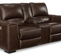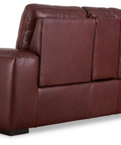 Impressive in scale while keeping an air of refinement, this power reclining loveseat stuns with a combination of soft, supple leather and perfectly matched faux leather upholstery in garnet. Sink into the seating area and cater to your comfort with one-touch power reclining and an adjustable headrest. Complete with USB charging, this loveseat makes a surefire statement in your contemporary living room.