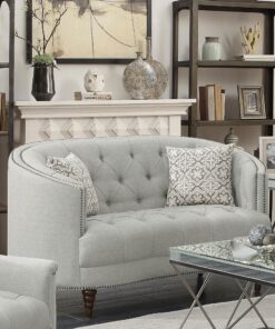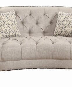 Show off your elegant sense of style with this chic, sophisticated loveseat. With a lovely, curved silhouette, it exudes refined taste and classic charm. Soft, muted grey upholstery matches effortlessly with a variety of color palettes. Beautiful button tufting and bold nailhead trim bring its traditional design to life. Perfect for a parlor or great room, this loveseat is a glamorous choice.