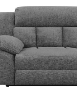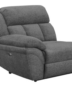 Designed for seamless modular integration, this right-arm facing power recliner enhances sectional configurations with plush seating and smooth reclining. Upholstered in soft charcoal fabric, it features deep cushioning and a channel-tufted backrest for enhanced support. The power reclining function offers effortless adjustability at the touch of a button, providing personalized comfort. A padded armrest adds to the relaxation experience.