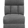 Designed for seamless modular integration, this armless chair expands seating space while maintaining a cohesive look. Upholstered in soft charcoal fabric, it features plush padding and a channel-tufted backrest for enhanced comfort. With a non-reclining design, it offers firm and supportive seating, making it an excellent addition to any sectional configuration. Built for durability, it ensures lasting stability and comfort.