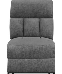 This armless non-power recliner brings flexibility and comfort to modular sectional configurations. Upholstered in soft charcoal fabric, it features plush cushioning and a channel-tufted backrest for ergonomic support. The manual reclining function allows for smooth adjustments, providing personalized relaxation. Designed to seamlessly blend with other sectional components, this piece enhances both comfort and versatility in any seating arrangement.