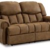 Expansive elegance. This reclining loveseat makes a sizable style statement. Its large scale enhances the luxe appearance, magnifying the beauty of richly warm brown faux leather. Polishing off the piece is an effortless reclining motion, which adds a layer of function to this masterclass in form.