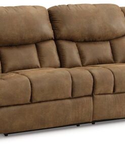 Expansive elegance. This reclining sofa makes a sizable style statement. Its large scale enhances the luxe appearance, magnifying the beauty of richly warm brown faux leather. Polishing off the piece is an effortless reclining motion, which adds a layer of function to this masterclass in form.
