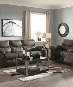 Rock the cool look of leather minus the hefty price tag with this reclining sofa. Rich with tonal variation, the indulgently soft upholstery sure looks like the real thing. And talk about indulgent comfort. Double stuffed armrests and sumptuous cushions cradle and support in all the right places. Distinctive scooped stitching enhances this reclining sofa’s contemporary flair.