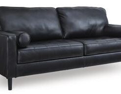 This sofa embodies timeless mid-century elegance with its linear design, sleek track arms and tapered legs. Genuine leather in the seating area adds a luxurious touch to the overall look. Experience endless style opportunities for today’s living spaces.
