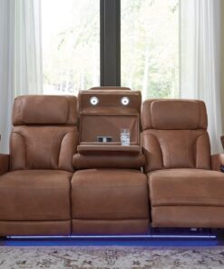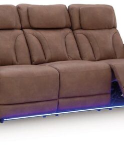 Ready to relax in style? Our luxurious power reclining sofa doesn’t just look fantastic—it also delivers creature comforts and fabulous functionality. Adjustable headrests ensure a perfect TV view no matter how far back you recline. Faux leather upholstery, a drop-down table with reading lights and ambient LED lighting go beyond your typical theater-style experience. Movie nights and chill time just got a whole lot sweeter.
