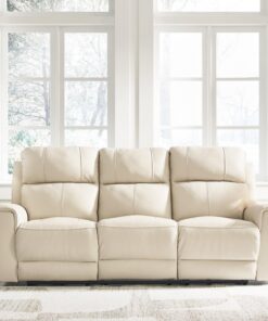 Focus on function. This practical power reclining sofa balances contemporary character and irresistible comfort. Its affordable, expertly matched leather and faux leather upholstery keeps your style up to speed without breaking the bank. Reclining at the touch of a button, the sofa plays well in relaxed, luxe seating areas made for quality time.