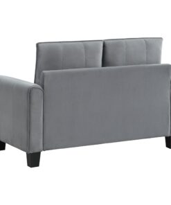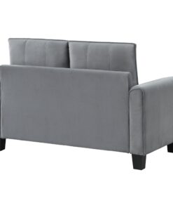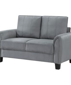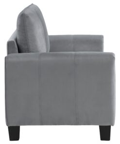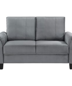 Embrace modern elegance with the refined look of a contemporary upholstered loveseat. Designed for understated character and timeless elegance, it boasts soft gray fabric with a velvety texture that encourages a cozy but sophisticated presence in your living room or den. The loveseat offers a compact profile, complete with rounded arms and plush cushions. Excellent support is provided with sinuous spring decking under the seats, and back cushions are reversible. The loveseat stands on tapered block legs in a black finish for a crisp finishing touch.