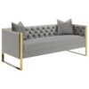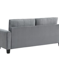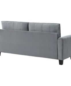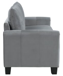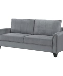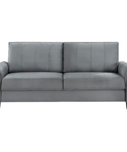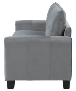 Captivating character blends with timeless style in a modern upholstered sofa. In gray upholstery that’s soft like velvet, the sofa is a lovely focal point for a living room seating group, offering refined, understated style and plenty of comfort. Rounded armrests feature gentle pleating for a smooth, sleek look and feel. Stitching accents and block feet complete the look, offers depth and structure. Back cushions are reversible, great for busy homes.