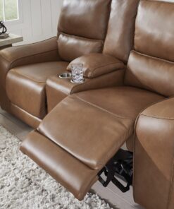 Live and lounge luxuriously. This power reclining loveseat brings an ultra-stylish flair to your home’s central hub. Its seating area is wrapped in top-grain leather in a rich caramel coloration, giving you a trend-right look made all the better with high-quality materials. And with the simple push of a button, you can recline or adjust the headrests to find your ideal comfort position.
