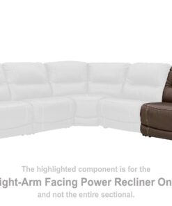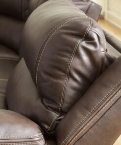 Load up on comfort in a cool, clean-lined and contemporary way with this power reclining loveseat in chocolate brown. Rest assured, the leather match upholstery is enriched with a pebble grain effect for authentic appeal and enhanced with jumbo stitching for dramatic contrast. It features a one-touch power control with adjustable positions, along with an Easy View™ adjustable headrest that allows a primo view of the TV even when you’re reclined. Extended ottomans provide extra length for leg comfort. A zero-draw USB plug-in at your fingertips lets you charge up as you chill out.