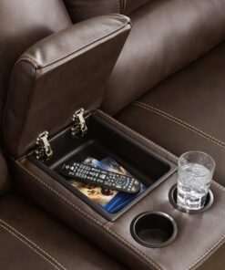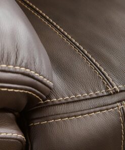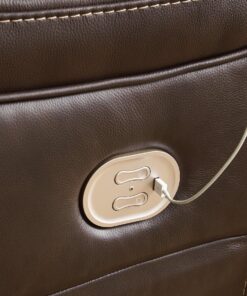 Load up on comfort in a cool, clean-lined and contemporary way with this power reclining loveseat with console in chocolate brown. Rest assured, the leather match upholstery is enriched with a pebble grain effect for authentic appeal and enhanced with jumbo stitching for dramatic contrast. It features a one-touch power control with adjustable positions, along with an Easy View™ adjustable headrest that allows a primo view of the TV even when you’re reclined. Extended ottomans provide extra length for leg comfort. A zero-draw USB plug-in at your fingertips lets you charge up as you chill out.