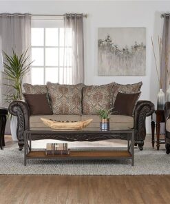 Bring robust design and a veritable tapestry of color and pattern to your living room with this traditional loveseat. It stands out with dramatic rolled arms augmented with smooth dark brown faux leather that adds depth and contrast to coordinating fabrics. Seat cushions feature light brown, while back pillows are patterned in complementary hues, offering refined flair for your sitting area. A pair of accent pillows complete the plush look, complete with fringe trim that mirrors the back pillows. The front and arms are further augmented with carved details, offering a loveseat that ensures a rich, refined ambiance.
