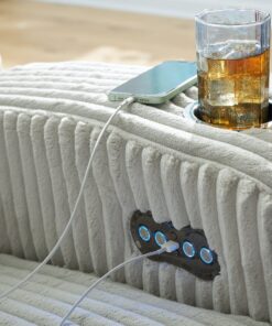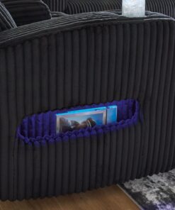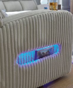 Trend-right style, meet irresistible modern function. Your living room gets a cozy-cool upgrade with this power reclining sofa. Curl up in its ultra-chic corded upholstery and recline with one-touch controls. Is it movie night or game time? With ambient LED lighting and wireless audio connectivity, this sofa transforms from a serene relaxation spot to an entertainment hub. Its drop-down table, USB charging and cup holders make lounging all the more convenient.