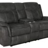 Every entertainment area deserves this glider loveseat with console. The neutral color palette makes it easy to blend with your decor. Its leatherette upholstery ensures a comfortable seating experience. A center console offers a small storage area for remotes with a lift-top container within. Find an easy place to store drinks with the built-in stainless steel cupholders.
