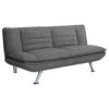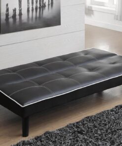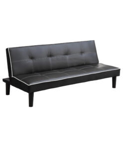 Add sleek and versatile structure to any living room with this black sofa bed. Featuring a modern silhouette, the cushions rest on top of a durable kiln dried hardwood frame. The dark leatherette upholstery is given contrast with a lightly hued piping and square-shaped tufting. Designed for comfort, this sofa bed is complete with sinuous spring decking and high-density foam. This sophisticated piece is also available in grey with black piping and brown with tan piping.
