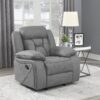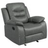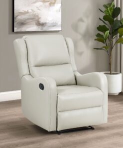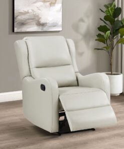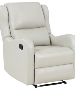 Kick up your feet in style with a graceful modern recliner in your living room or den. It’s a versatile design that pairs clean, sleek lines with English arms that slope beautifully to create refined aesthetics in your home. The recliner features faux leather upholstery in neutral ivory, offering smooth, supple style and elegance. The recliner is complete with foam cushions, providing enduring support and comfort, perfect for lounging and relaxation. Smooth and sleek, this contemporary recliner is at home in both relaxed and more formal living spaces.