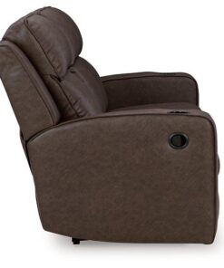Indulge your lust for comfort and love for contemporary design with this reclining sofa. Made for easy everyday living, it’s upholstered in a heavyweight padded faux leather and accented with contrast jumbo stitching for fashion-forward flair. Sleek track arms elevate the look with a touch of modern sensibility. A drop-down table with dual cup holders and USB charging completes the experience.