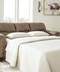 If you love the cool look of leather but long for the warm feel of fabric, you can take comfort in this queen sofa sleeper. Wrapped in a fabulous faux leather with a weathered hue and hint of pebbly texture to resemble the real deal, this decidedly modern sofa proves less is more. Elements include angled side profiling and track armrests wrapped with a layer of pillowy softness for that little something extra. Prominent jumbo stitching and clean-lined divided back styling lend fashion-forward flair. Rest assured, the queen memory foam mattress comfortably accommodates overnight guests.