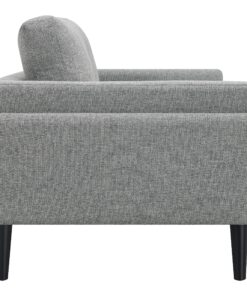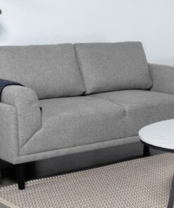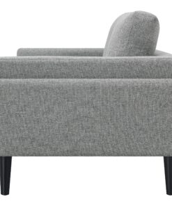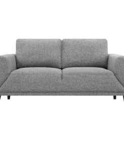 Unveiling our modern loveseat, where innovation meets elegance in a frame within a frame design. Adorned in a chic fabric, its streamlined silhouette is highlighted by meticulous topstitch details and track arms complemented by mitered front accents. Prioritizing comfort, the sofa comes with reversible back cushions and pocket coil seat construction, ensuring a snug and supportive seating experience. Anchored by tall, black cylinder-shaped wooden legs, this sofa stands as a blend of style and function, ready to be the centerpiece in any contemporary living space.