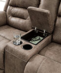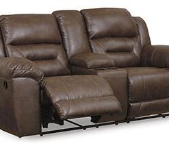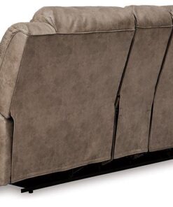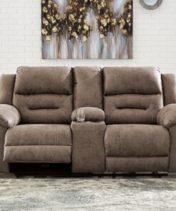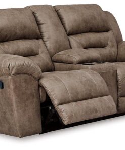 For those that love the cool look of leather but long for the warm feel of fabric, this reclining loveseat with console delivers both with ease. Its high-performance padded faux leather is remarkably durable and easy to clean, just the thing for family spaces. Channel-stitched back cushions provide indulgent lumbar support for maximum comfort—not to mention fashion-forward flair.