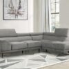 Providing ample seating in modern form is the Tesoro Collection. The classic sectional shape is comprised of a selection of individual components each providing functional complement to the overall design and covered in dark gray fabric providing a neutral palette for your decorative preferences. The manual reclining mechanism brings you to your desired position with a pull of the side mounted tab.