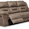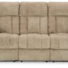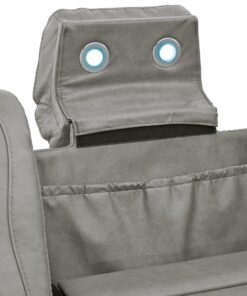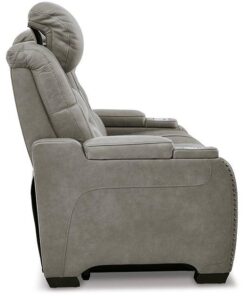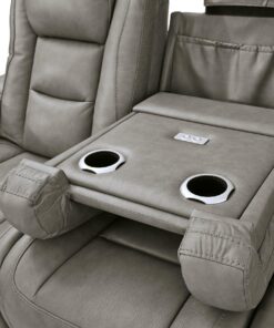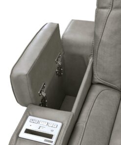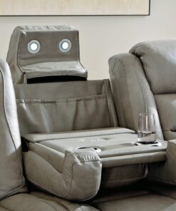 Reserved for him and made for her, this power reclining sofa in gray delivers all the comfort and style you could ask for. Inspired by sports car interiors, the combination leather and faux leather upholstery has a ‚perforated automotive treatment for that much more appeal. Positioned at your fingertips, the advanced one-touch power control puts you in the driver’s seat with everything from an Easy View™ power headrest and power lumbar support, to a USB port and wireless charging for your phone. Talk about fully loaded. The middle seat reveals a pull-down table with dimmable reading lights and cup holders. And with integrated cup holders and hidden storage compartments under the posh, padded armrests, this designer power reclining sofa makes the most of every inch of space.