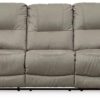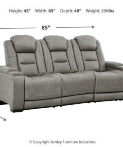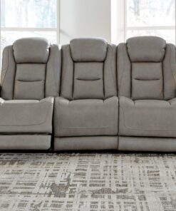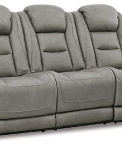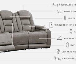 Reserved for him and made for her, this power reclining sofa in gray delivers all the comfort and style you could ask for. Inspired by sports car interiors, the combination leather and faux leather upholstery has a ‚perforated automotive treatment for that much more appeal. Positioned at your fingertips, the advanced one-touch power control puts you in the driver’s seat with everything from an Easy View™ power headrest and power lumbar support, to a USB port and wireless charging for your phone. Talk about fully loaded. The middle seat reveals a pull-down table with dimmable reading lights and cup holders. And with integrated cup holders and hidden storage compartments under the posh, padded armrests, this designer power reclining sofa makes the most of every inch of space.