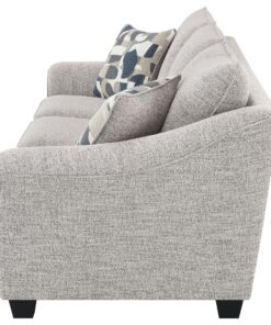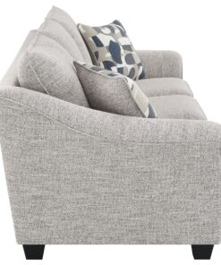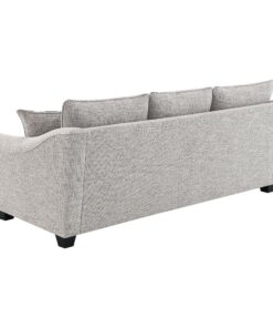 Create comfortable seating while embracing style with this well-tailored sofa collection. Upholstered in a textured, multidimensional gray boucle fabric, it’s perfect for camouflaging wear and offers impressive texture and dimension in your living room. The sofa features sloped arms, boxed seat cushions, and tall back pillows, all finished with welt trim, offering wonderful comfort and support for seating and lounging. A classic silhouette is updated with gently sloping, flared armrests, creating a fresh, inviting profile. The design is completed with tall, tapering block legs in a dark finish, providing a sturdy foundation and completing the look.