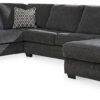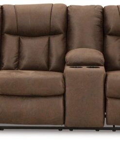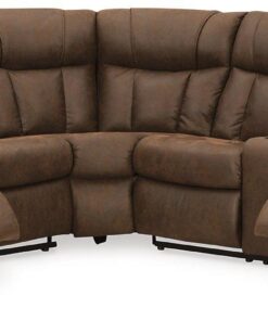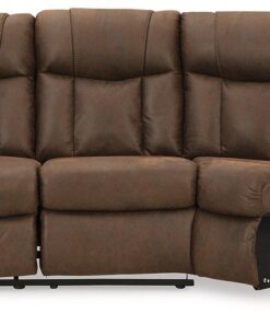 Melt into comfort at the end of your day. Accented by jumbo stitching, the supple walnut faux leather and sumptuous cushioning cradle your body in infinite positions of leisure. Simply pull the tab to recline. With dual cup holders and convenient console storage, this reclining sectional makes relaxation your sweet reward for all you do.