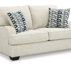 This loveseat has the corner on casual contemporary style and everyday comfort. Chic and subtly innovative, its crosshatched chenille upholstery is a forward-thinking take on fashionable neutrals. The sleek frame gets a soft, streamlined touch with sloping track arms. Eclectic accent pillows further appeal to your relaxed approach to modern flair.
