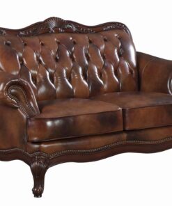 Seat two in style while delivering an elegant traditional motif. Perfect for a study or den, this leather love seat shows off beloved, ornate design features. Rolled arms and a button-tufted seat back preserve stylish allure. Decorative moldings and individually place nail heads embellish its sophisticated and romantic silhouette. Wrapped in luscious tri-tone top grain leather, this love seat stands out as an enticing part of a seating ensemble.